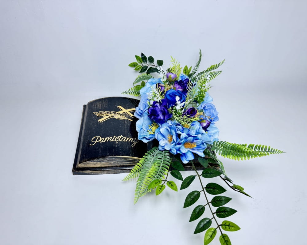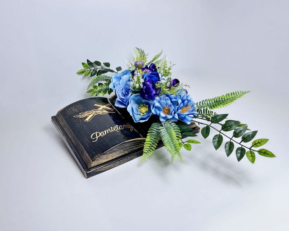 Kompozycja nagrobna „Pamięć” to połączenie symboliki i subtelnego piękna. Na eleganckiej podstawie w formie otwartej książki umieszczono efektowny układ sztucznych kwiatów w odcieniach niebieskiego, granatu i zieleni. Księga wykonana jest z trwałego materiału imitującego postarzone drewno, z wyraźnymi detalami: zarysem kart i złotym napisem „Pamiętamy”, który podkreśla jej wyjątkowy, pamięciowy charakter.