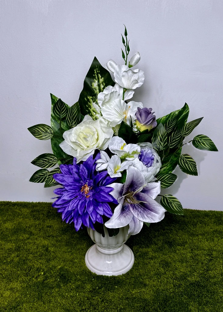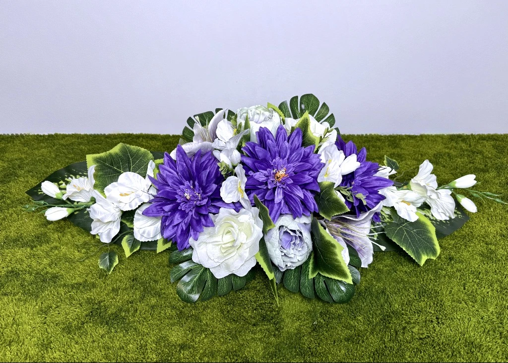Prezentowany produkt to ciekawy zestaw kompozycji, składający się z podłużnej wiązanki na płytę nagrobną oraz pięknego bukietu do wazonu. Sercem aranżacji są intensywnie fioletowe dalie o misternym ułożeniu płatków, które w połączeniu z czystą bielą tworzą wyjątkowo szlachetny kontrast. Ważnym elementem strukturalnym są strzeliste mieczyki, które nadają całości dynamiki i odpowiedniego rozmachu. Te nowoczesne stroiki ze sztucznych kwiatówbazują na wyselekcjonowanych komponentach, które do złudzenia przypominają żywe rośliny. Biało-fioletowe lilie o satynowym wykończeniu oraz puszyste piwonie dopełniają tę gęstą formę, tworząc harmonijny obraz na każdym nagrobku. Wybierając ten szlachetny stroik na cmentarz, zyskują Państwo dekorację, która łączy w sobie tradycyjne motywy z nowoczesnym podejściem do funeralnego designu. Gustowne kwiaty na cmentarz w tej kolorystyce są uniwersalnym sposobem na oddanie szacunku bliskim.
