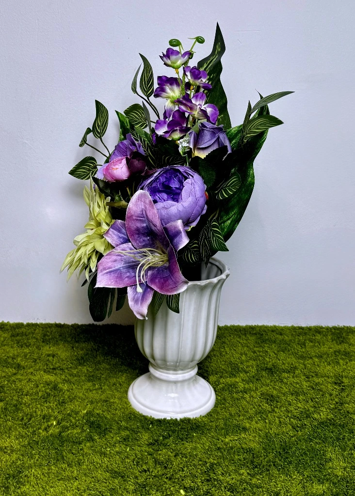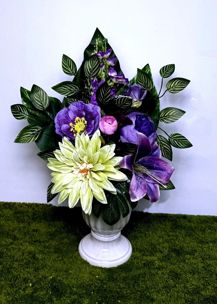 Prezentowany produkt to piękna kompozycja kwiatowa, w której centralny punkt stanowi seledynowa dalia o gęstym ułożeniu płatków. Kompozycje akcentuje strzelista fioletowa ostróżka oraz fioletowa lilia o satynowej teksturze. Kompozycja zawiera również fioletową piwonię w pełnym rozkwicie oraz drobne pąki. Ten nowoczesny stroik ze sztucznych kwiatów bazuje na materiałach typu premium, co zapewnia doskonały realizm botaniczny i nasycone barwy odporne na słońce. Każdy kwiat cechuje się wysoką jakością, co sprawia, że całość wygląda naturalnie i zachowuje świeży wygląd przez długi czas. Ten nietuzinkowy bukiet na cmentarz łączy rzadkie zestawienie kolorystyczne, które pięknie rozświetla nagrobek.