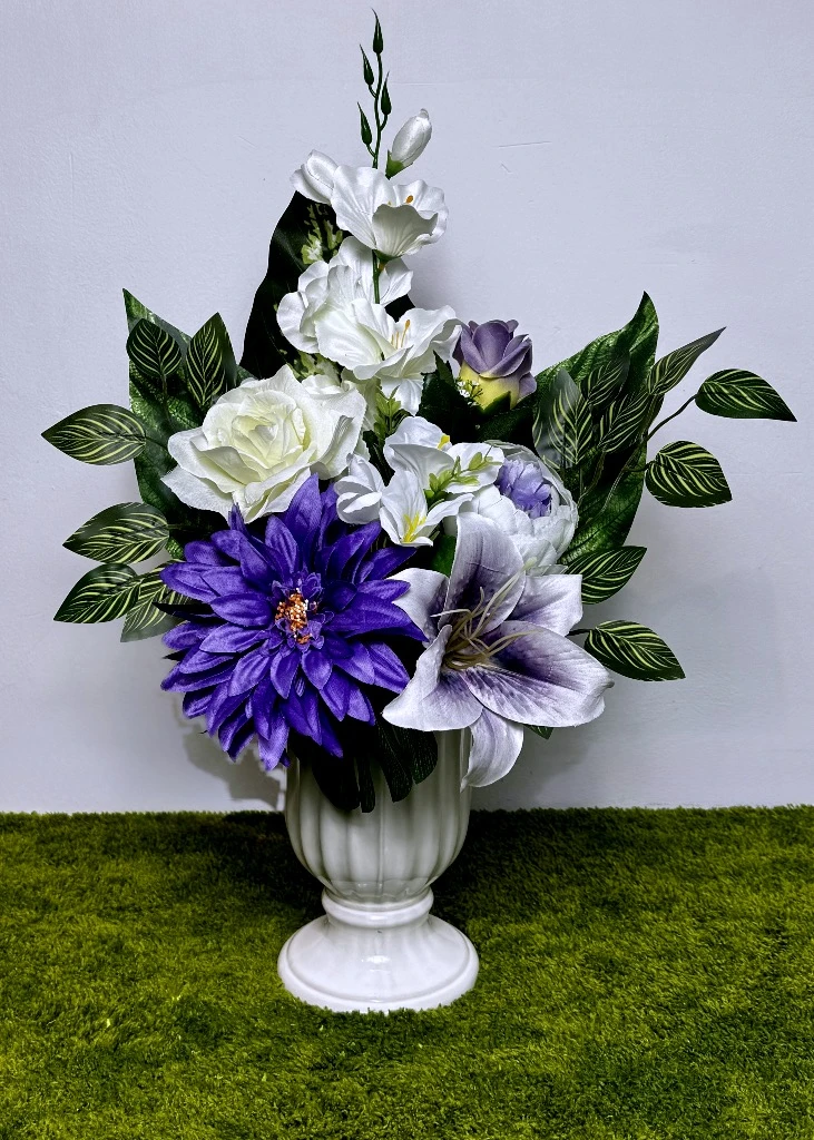 Oprawę dla kwiatostanów tworzą szerokie liście paproci oraz matowe gałązki eukaliptusa o szaro-zielonym odcieniu. Jako gęsty wypełniacz florystyczny posłużył zielony mirt oraz ząbkowane liście róż, które skutecznie eliminują prześwity wewnątrz naczynia. Wykorzystane sztuczne rośliny i liczne pąki kwiatowe posiadają pełną mrozoodpornośćoraz wysoką odporność UV. Dzięki temu fioletowy bukiet nie traci nasycenia barw pod wpływem trudnych warunków atmosferycznych. Florystyka funeralna od polskiego producenta to gwarancja, że ta całoroczna dekoracja zachowa sztywność i estetykę, stanowiąc dystyngowany wybór na każdy grobowiec rodzinny.