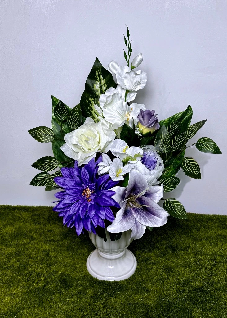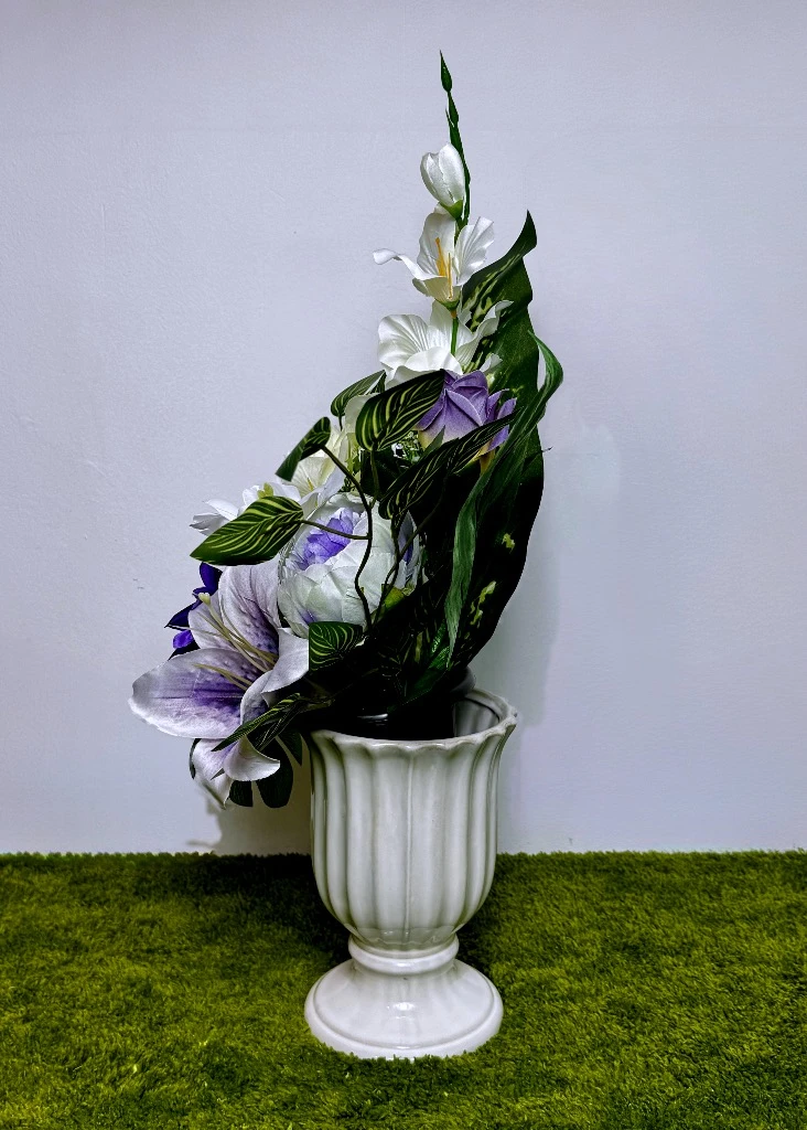 Prezentowany produkt to piękna kompozycja kwiatowa, w której centralny punkt stanowi fioletowa dalia o gęstym ułożeniu płatków. Konstrukcję pionową akcentuje strzelisty biały mieczyk oraz biało fioletowa lilia o satynowej teksturze. Kompozycja zawiera również fioletową piwonię w pełnym rozkwicie oraz klasyczną białą różę. Ten nowoczesny stroik ze sztucznych kwiatów bazuje na materiałach typu premium, co zapewnia doskonały realizm botaniczny i nasycone barwy odporne na słońce. Każdy kwiat cechuje się wysoką jakością, co sprawia, że całość wyglądają naturalnie i zachowuje świeży wygląd przez długi czas.