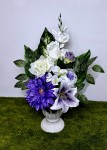 Dalia i lilie – stroik do wazonu w odcieniach bieli i fioletu | Bukiet na cmentarz