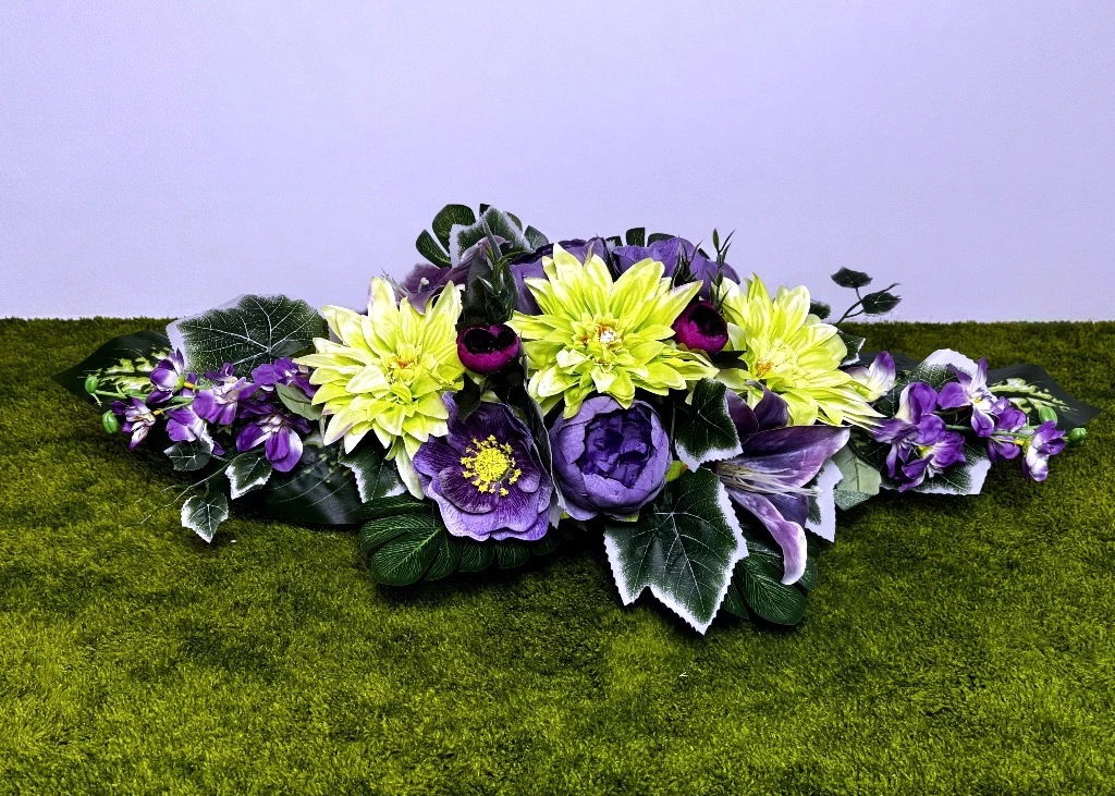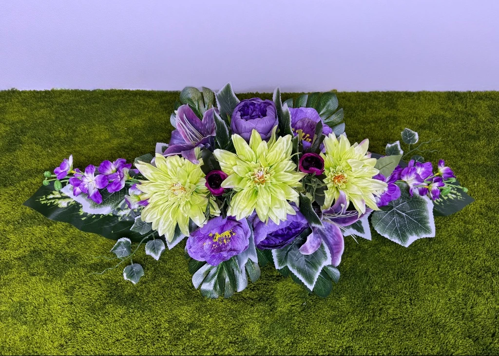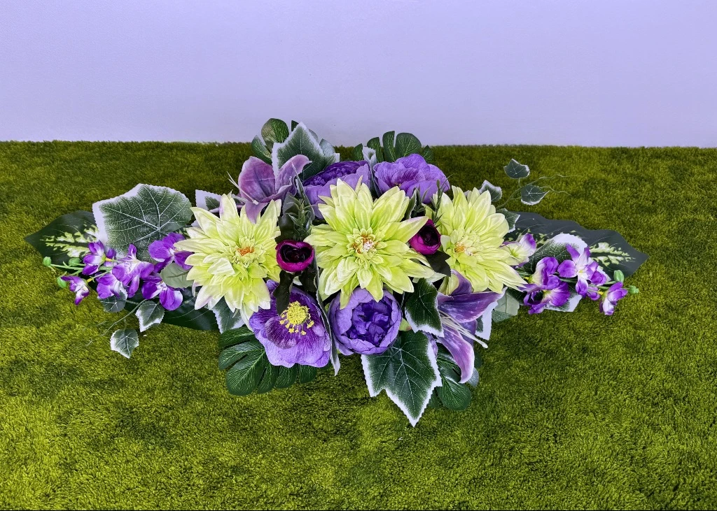 Prezentowany produkt to piękna kompozycja kwiatowa, w której centralny punkt stanowią trzy seledynowe dalie o gęstym ułożeniu płatków. Konstrukcję akcentują fioletowe piwonie w pełnym rozkwicie oraz fioletowe lilie o satynowej teksturze. Całość dopełnia fioletowa ostróżka umieszczona na krańcach oraz drobne pąki kwiatowe w ciemniejszym odcieniu. Ten nowoczesny stroik ze sztucznych kwiatów bazuje na materiałach typu premium, co zapewnia doskonały realizm botaniczny i nasycone barwy odporne na słońce. Każdy kwiat cechuje się wysoką jakością, co sprawia, że całość wygląda naturalnie i zachowuje świeży wygląd przez długi czas. Ten stroik na cmentarz został zaprojektowany w formie wydłużonej łodzi, idealnie pasującej na środek płyty nagrobnej.