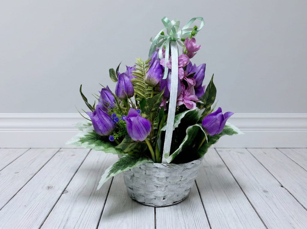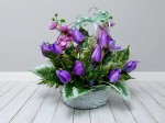 Fioletowy kosz - Wiosenna kompozycja z tulipanów i ostróżek | Stroik na cmentarz