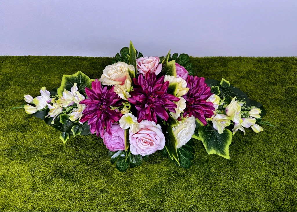 Prezentowany produkt to piękna kompozycja kwiatowa, w której centralny punkt stanowią fuksjowe dalie o gęstym ułożeniu płatków. Konstrukcję podłużną akcentują strzeliste mieczyki umieszczone na krańcach, które nadają aranżacji odpowiedniego rozmachu i elegancji. Kompozycja zawiera również jasnoróżowe róże w pełnym rozkwicie oraz brudnoróżowe piwonie o satynowej teksturze. Ten nowoczesny stroik ze sztucznych kwiatów bazuje na materiałach typu premium, co zapewnia doskonały realizm botaniczny i nasycone barwy odporne na słońce. Każdy kwiat cechuje się wysoką jakością, co sprawia, że całość wygląda naturalnie i zachowuje świeży wygląd przez długi czas. Taka efektowna wiązanka na cmentarz to przykład precyzyjnego rzemiosła, które łączy intensywną kolorystykę z klasyczną formą.