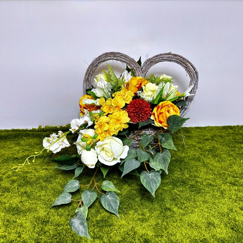 Wiosenny czas to moment, w którym barwy stają się symbolem odrodzenia, a nasza najnowsza propozycja, zatytułowana Kosz pełen słońca, idealnie oddaje tę energię. Centralnym punktem tej rozbudowanej kompozycji są intensywnie żółte róże, które dzięki subtelnym pomarańczowym refleksom wyglądają niezwykle naturalnie i ciepło. Kwiaty te zostały osadzone w białym, wiklinowym naczyniu o symbolicznym kształcie serca, co nadaje całości dystyngowanego i pełnego emocji charakteru. Ten duży zestaw florystyczny został zaprojektowany z myślą o osobach poszukujących dekoracji, która połączy świeżość wiosennej łąki z elegancją profesjonalnego rzemiosła. Dzięki swojej imponującej skali, produkt ten doskonale wypełnia przestrzeń, działając rozświetlająco na każde miejsce, w którym zostanie wyeksponowany, będąc wyrazem najwyższej dbałości o estetykę.