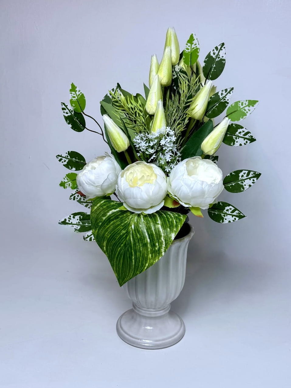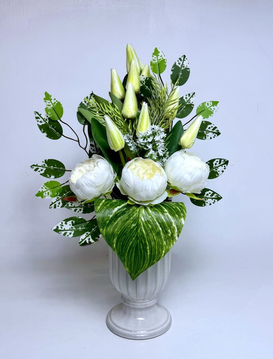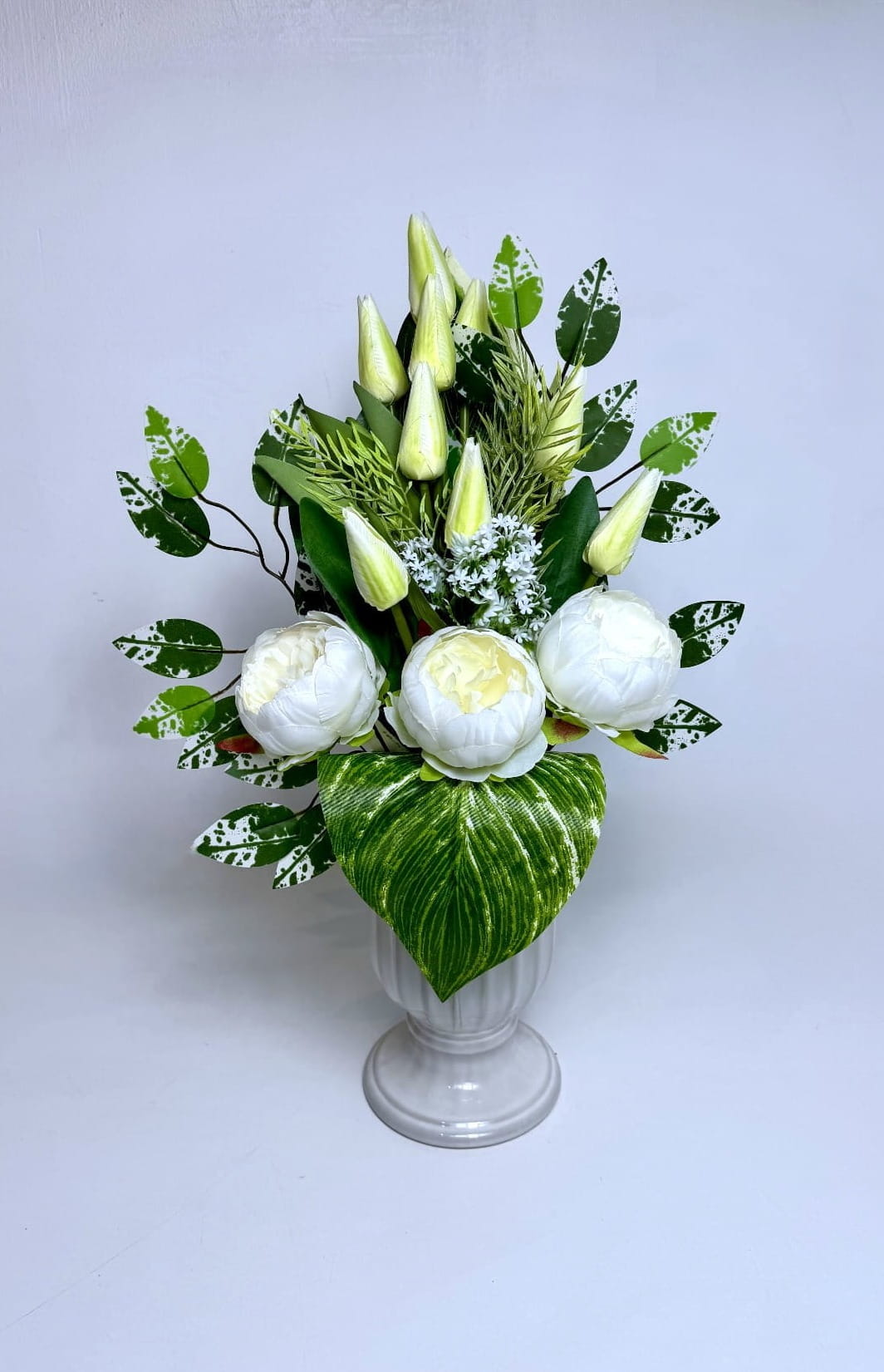 Ta nowoczesna i niepowtarzalna kompozycja kwiatowa została stworzona z myślą o estetycznym i trwałym udekorowaniu miejsca spoczynku bliskich. Bukiet składa się z dobrej jakości sztucznych kwiatów, które do złudzenia przypominają naturalne rośliny, zachowując przy tym swoją formę i kolor przez bardzo długi czas, niezależnie od panujących warunków atmosferycznych. Głównym punktem dekoracji są trzy okazałe, rozwinięte peonie w odcieniu czystej bieli oraz liczne, smukłe tulipany w kolorze delikatnego kremu, które pną się ku górze, nadając całości lekkości i strzelistego charakteru.