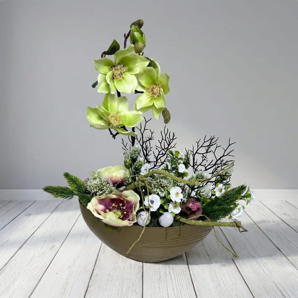 Ta uniwersalna dekoracja kwiatowa została zaprojektowana z myślą o szerokim zastosowaniu – od dekoracji wnętrz, poprzez tarasy, aż po miejsca pamięci. Centralnym punktem kompozycji jest szlachetna magnolia, która symbolizuje czystość i wytrwałość. Całość osadzono w nowoczesnej osłonce o kształcie łezki w kolorze połyskującego złota, co nadaje produktowi luksusowego i bardzo współczesnego charakteru.