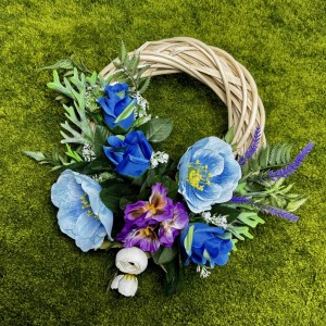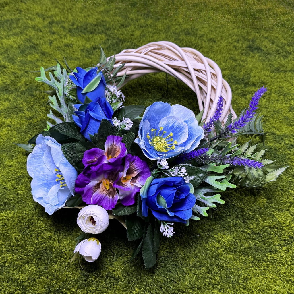 Ten nietuzinkowy i świeży wianek to idealny sposób na przywitanie wiosny w Twoim domu. Całość została przygotowana z dobrej jakości sztucznych kwiatów, co sprawia, że ta elegancka ozdoba zachowuje swój piękny i kwitnący wygląd przez bardzo długi czas, niezależnie od nasłonecznienia czy wilgoci. Centralnym punktem są intensywnie niebieskie sztuczne róże, które w połączeniu z fioletowymi bratkami tworzą rozświetlający efekt i harmonijną całość. Wykorzystana kompozycja kwiatowa na wiklinie to wyraz najwyższego kunsztu, gdzie kwiaty sztuczne jak żywe idealnie komponują się z naturalną, jasną bazą.