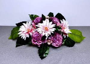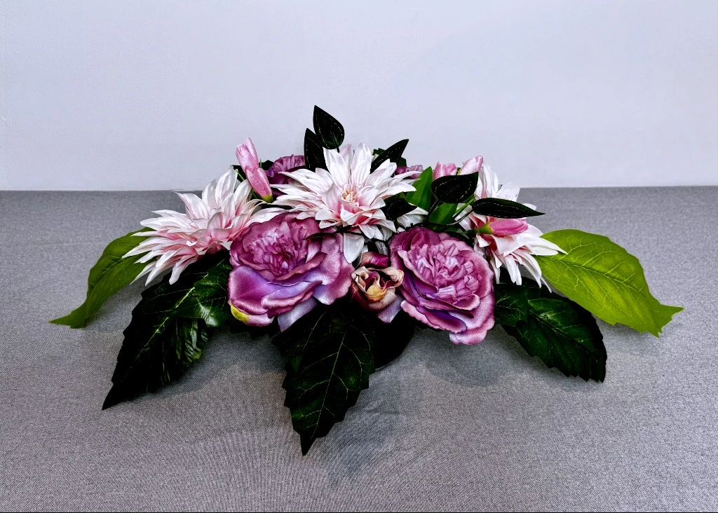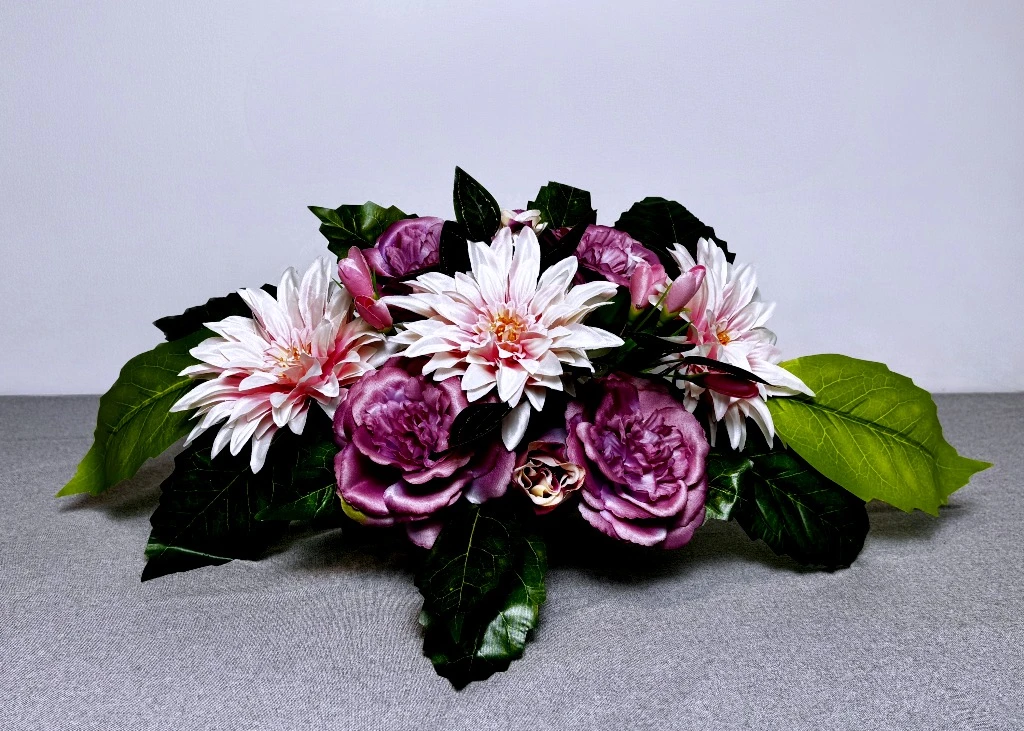 Wybór odpowiedniej dekoracji, która zachowa swój urok przez wszystkie pory roku, wymaga połączenia delikatnej estetyki z niezwykłą trwałością materiałów. Nasza propozycja to harmonijne zestawienie różu i kremu, które wnosi spokój oraz subtelność na miejsce spoczynku bliskich osób. Centralnym punktem aranżacji są okazałe kwiaty o zróżnicowanej teksturze, tworzące bogatą, owalną formę. Ta różowa wiązanka została zaprojektowana w taki sposób, aby jej horyzontalny profil idealnie przylegał do kamiennej powierzchni, stanowiąc dystyngowany akcent dekoracyjny. Dzięki przemyślanej kolorystyce, zestawienie to doskonale komponuje się zarówno z jasnymi, jak i ciemnymi odcieniami granitu, działając rozświetlająco na otoczenie. Każdy element został tu dobrany tak, aby godnie przyozdobić wybrany grobowiec, niezależnie od panującej aury.
