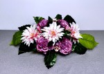 Wiązanka na cmentarz z różowymi daliami, piwoniami i różami.