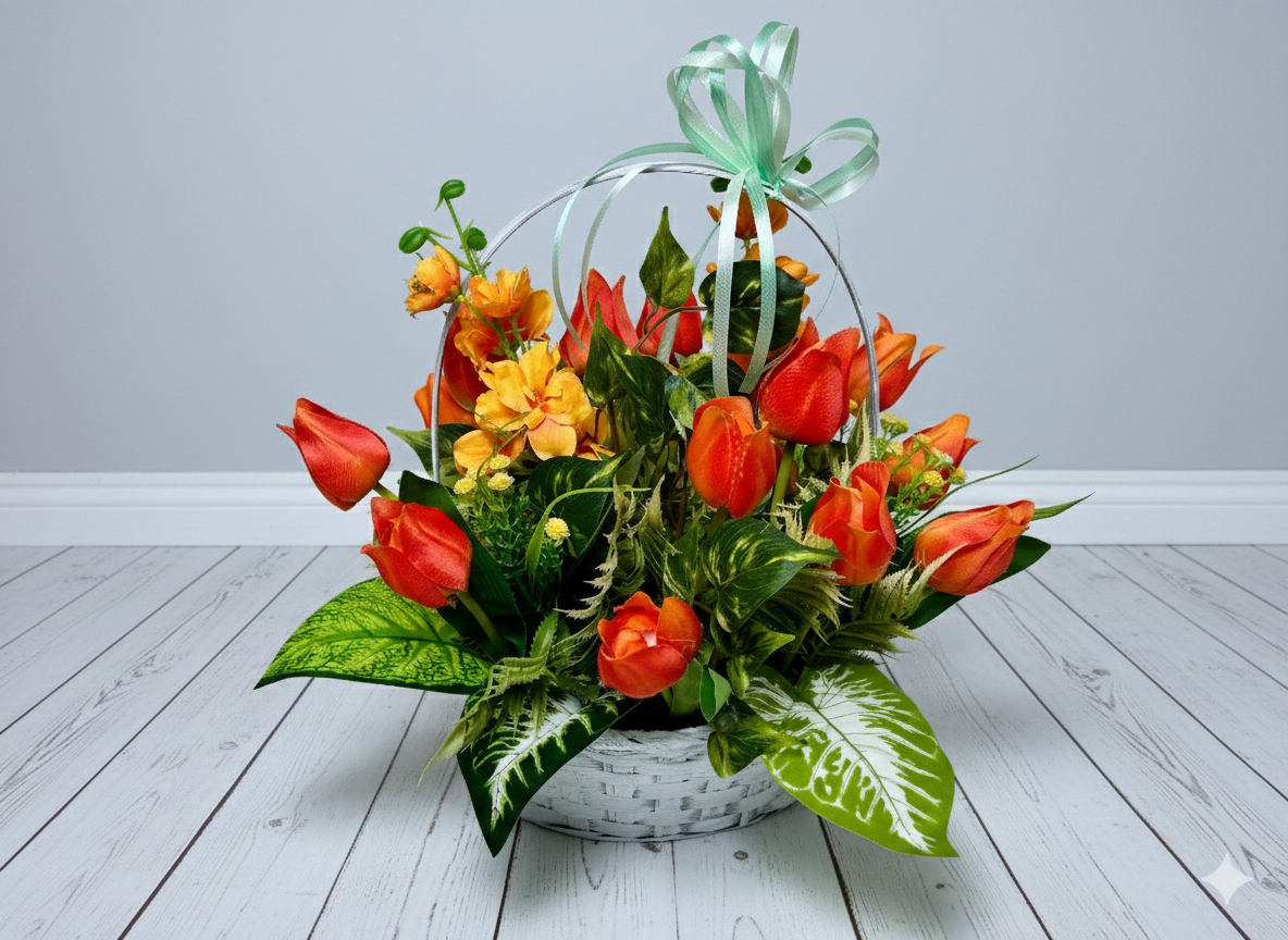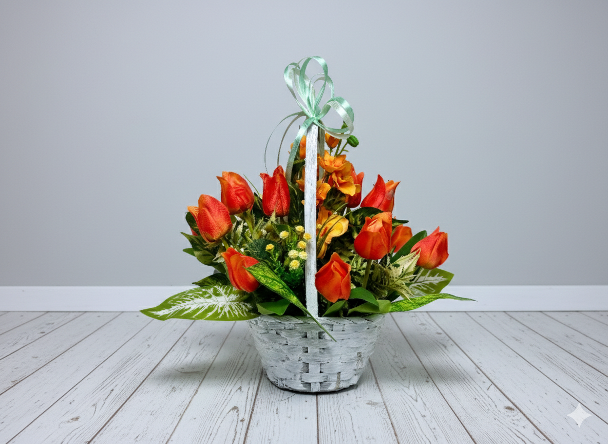 Pomarańczowy kosz - Wiosenna kompozycja z tulipanów i ostróżek | Stroik na cmentarz