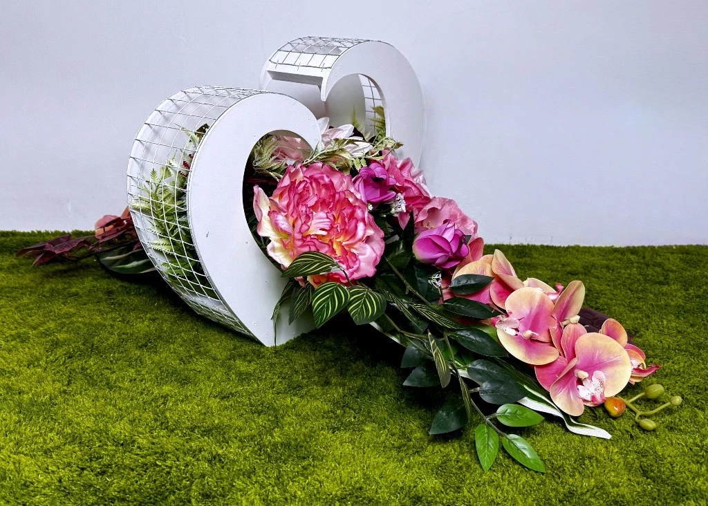 Fundamentem leżącej części kompletu jest biały, ażurowy kosz w kształcie serca, który nadaje całości lekkości, mimo swojej stabilności. Wnętrze naczynia wypełnia masa betonowa, dzięki czemu stroik na cmentarz pewnie trzyma się podłoża nawet przy zmiennej aurze. Rzemieślnicze wykonanie objawia się w gęstym rozmieszczeniu piwonii i róż, które całkowicie maskują konstrukcję. Tak przygotowana pamiątka charakteryzuje się wyjątkową trwałością, zachowując szlachetne barwy przez wiele miesięcy bez konieczności jakiejkolwiek pielęgnacji czy podlewania.