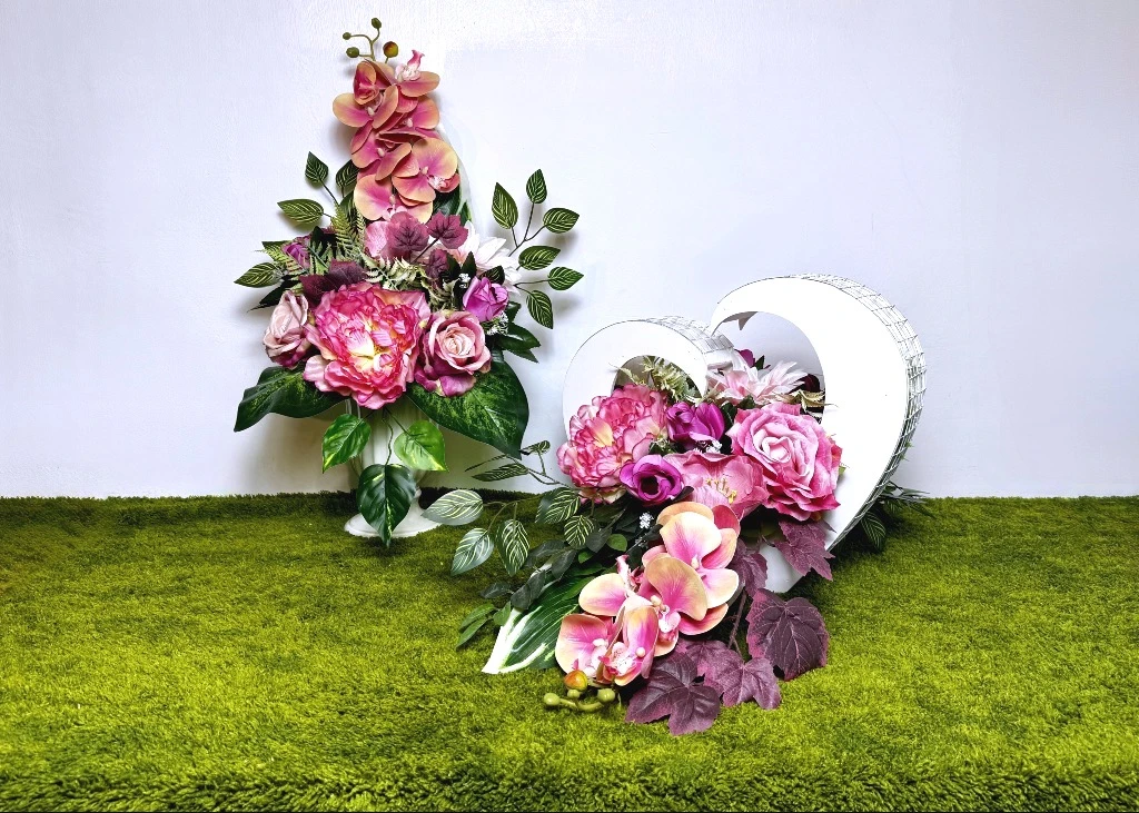 Prezentowane produkt to piękny i okazały zestaw kompozycji, składający się z podłużnej, dużej dwustronnej wiązanki na płytę nagrobną umieszczonej w białym sercu oraz pięknego bukietu do wazonu. Głównym atutem aranżacji są sylikonowe storczyki, które swoją teksturą i wyglądem przypominają żywe rośliny. Te nowoczesne stroiki ze sztucznych kwiatów to propozycja dla osób poszukujących nieszablonowych dekoracji, które godnie ozdobią estetyczny pomnik. Całość utrzymana jest w tonacji delikatnego i intensywnego różu, co tworzy spójną i harmonijną całość, idealną jako hołd dla bliskich na nekropolii.