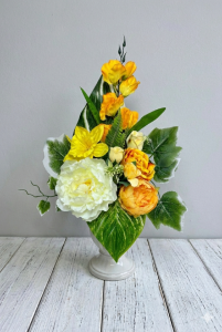 Kompozycja bazuje na harmonijnym przejściu od jasnych po nasycone odcienie barw słonecznych. Głównym punktem dekoracji jest duża, kremowo-biała piwonia o gęstych płatkach. Obok niej umieszczono kwiaty w odcieniach intensywnego pomarańczu i złocistej żółci, w tym pełne róże oraz jaskry. Wyraźnym akcentem jest jaskrawożółty żonkil, który nadaje całości wiosennej świeżości. Górną część kompozycji wieńczą strzeliste, żółte kwiaty przypominające pąki jaskrów, które nadają dekoracji smukły i elegancki kształt.