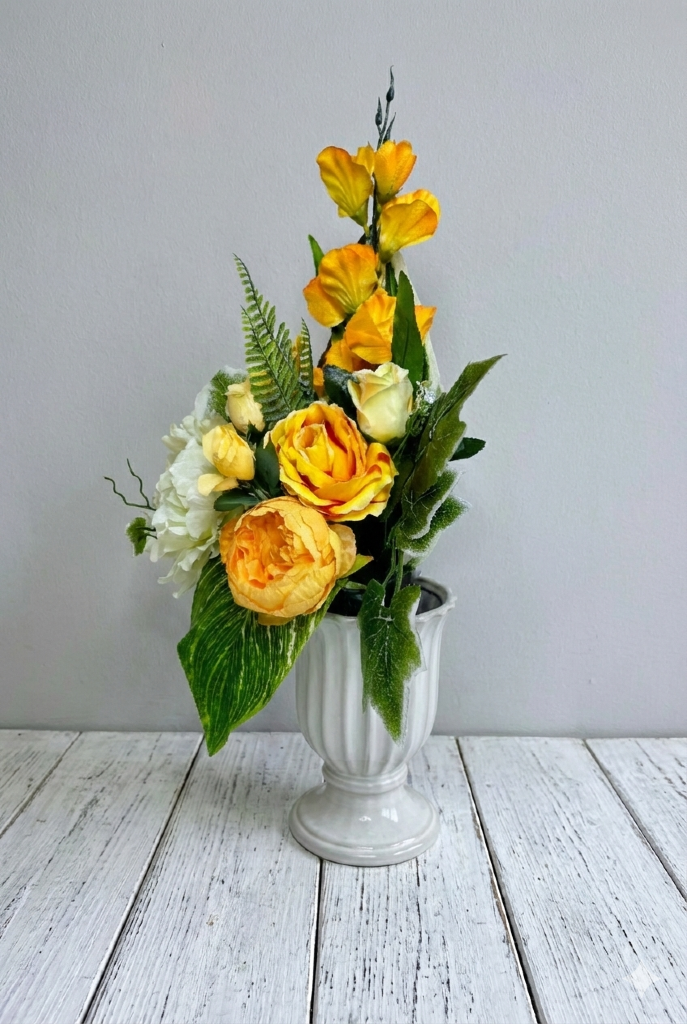 Bogata oprawa liściasta wykonana z dobrej jakości sztucznych roślin tworzy naturalne tło dla kwiatowych kielichów. Wykorzystano tu duże liście winorośli z białawym nalotem na brzegach, pióropusze zielonej paproci oraz szerokie liście funkii o dekoracyjnym unerwieniu. Całość jest trwale zamocowana w masie betonowej wewnątrz białego pucharu, co zapewnia stabilność i odporność na wiatr. Słoneczna kolorystyka sprawia, że kompozycja jest doskonale widoczna z daleka, stanowiąc estetyczną ozdobę, która ożywia każde miejsce spoczynku.