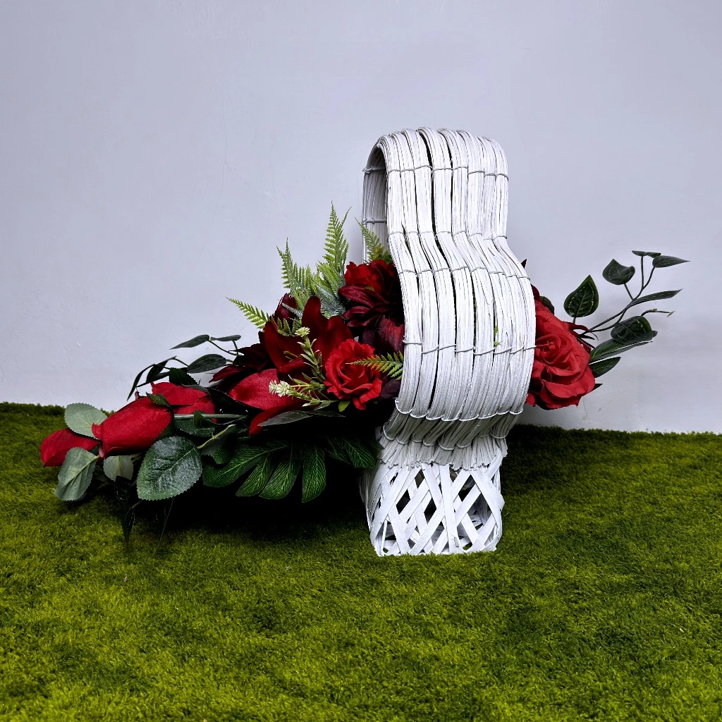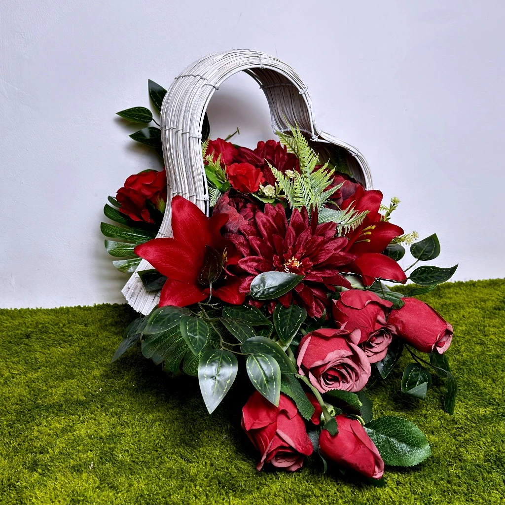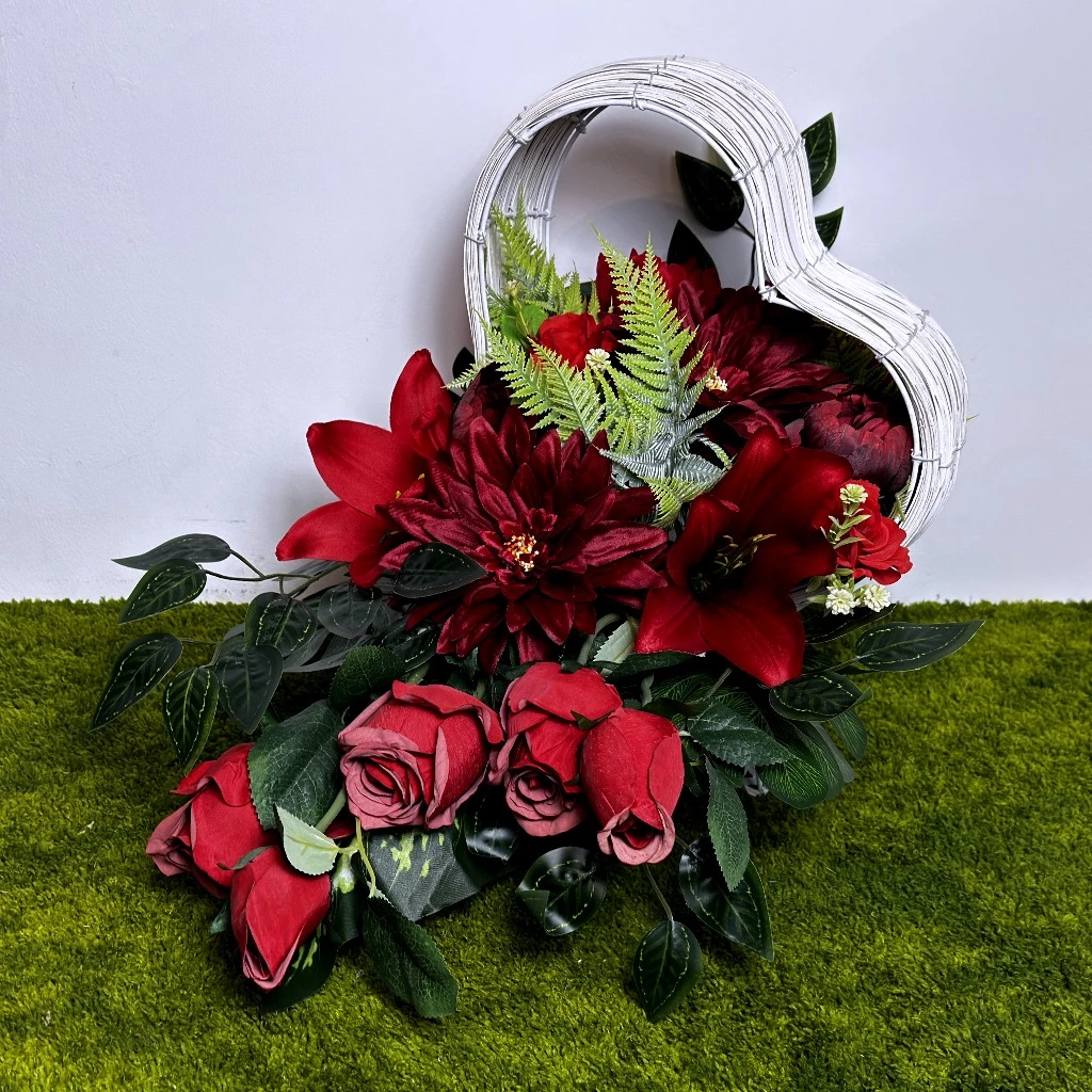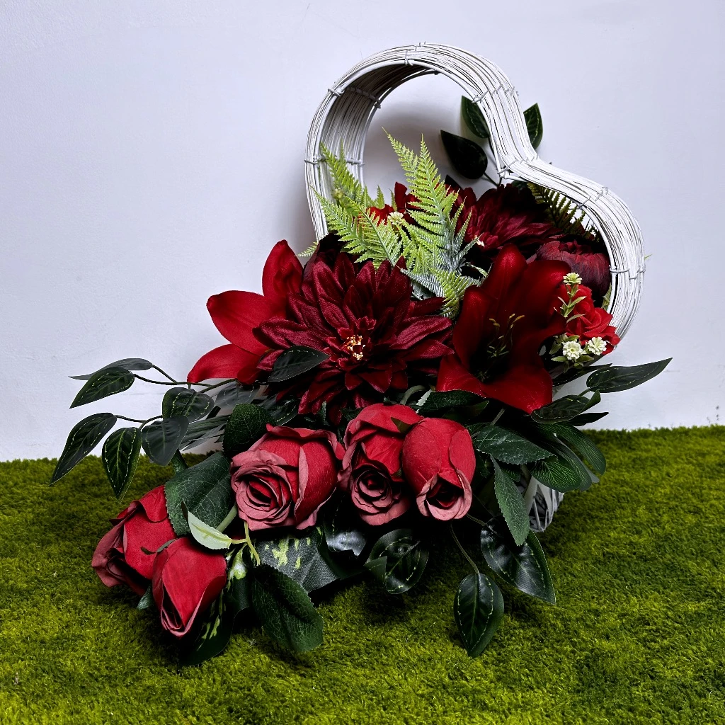 Nadchodząca wiosna to czas szczególnej zadumy, w którym pragniemy przyozdobić miejsca spoczynku bliskich osób w sposób wyjątkowy i pełen godności. Nasza najnowsza propozycja to kompozycja, która łączy w sobie intensywność barw z niezwykle subtelną formą. Głównym elementem dekoracji są okazałe czerwone lilie, których płatki zachwycają naturalną strukturą i głębią koloru. Towarzyszą im gęste czerwone dalie oraz klasyczne róże, symbolizujące miłość i nieprzemijającą pamięć. Całość została osadzona w unikatowym naczyniu, jakim jest biały kosz w kształcie serca. Biel splotu idealnie kontrastuje z ognistą barwą kwiatów, sprawiając, że ta wiosenna dekoracja rozświetla każdy grobowiec. Jest to propozycja dla osób ceniących nowoczesne stroiki ze sztucznych kwiatów, które łączą w sobie wysoką jakość wykonania z ponadczasowym designem.