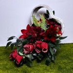 Piękny stroik na cmentarz z czerwonymi różami i liliami
