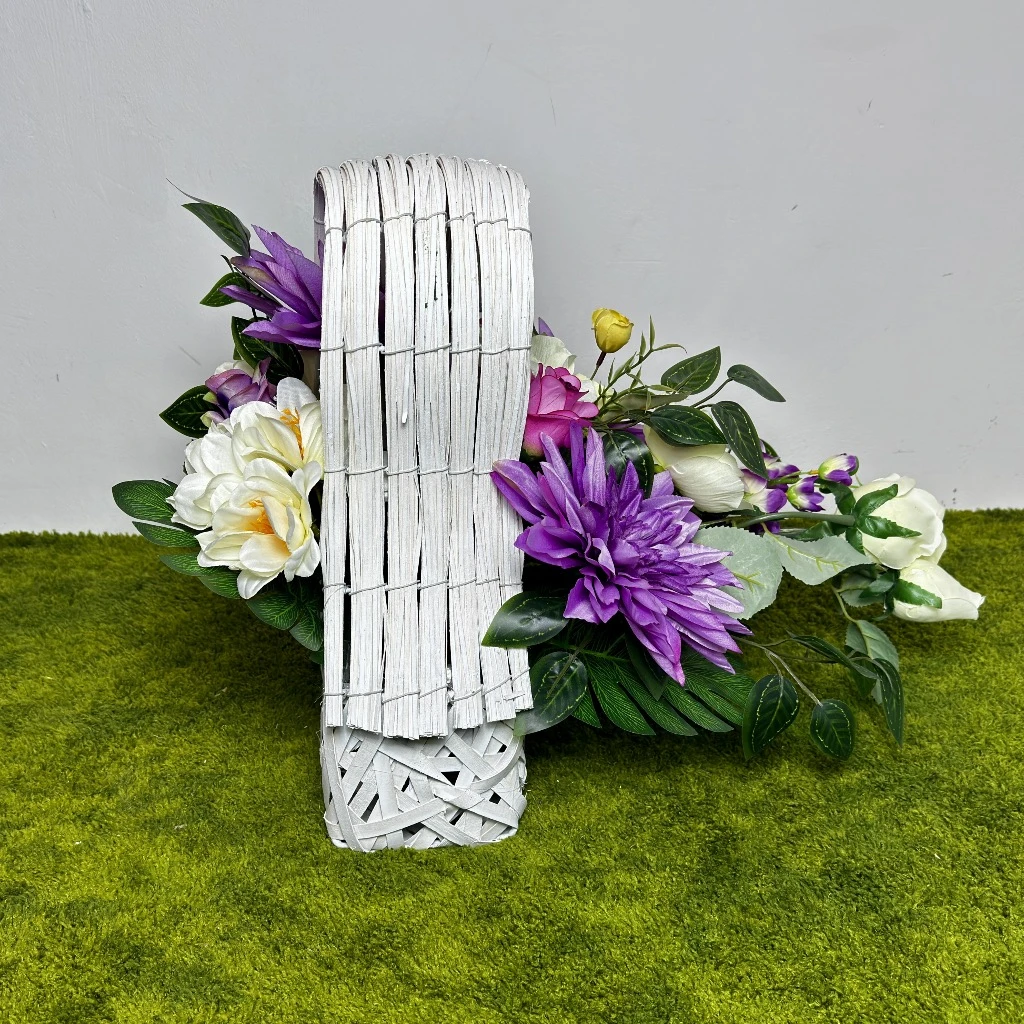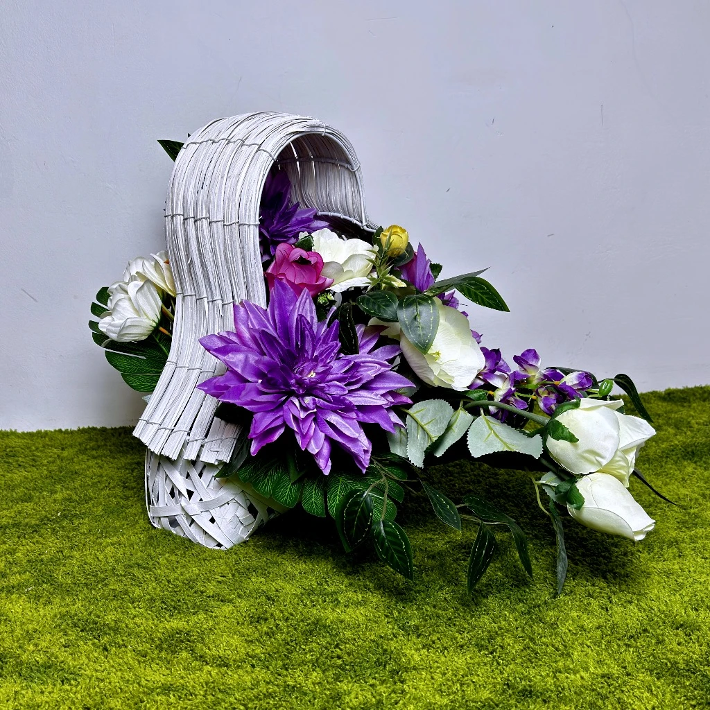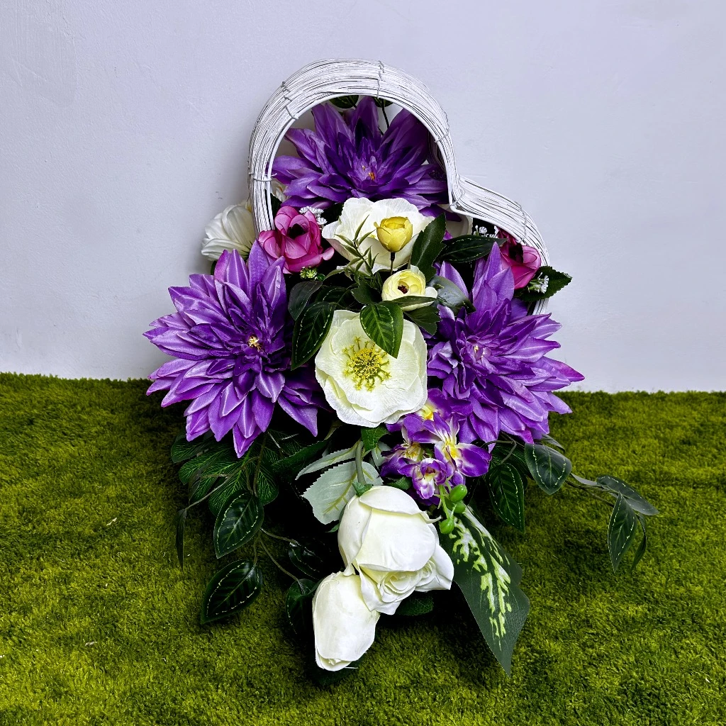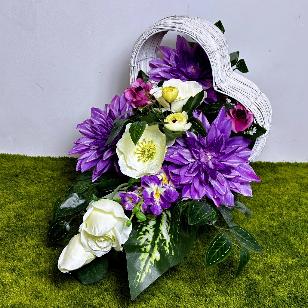 Wiosenny czas sprzyja wprowadzaniu świeżości do miejsc pamięci, a nasza fioletowa kompozycja w jasnej wiklinie jest tego najlepszym przykładem. Centralnym punktem aranżacji są okazałe, fioletowe dalie, które gęsto wypełniają przestrzeń, tworząc nasyconą barwą bazę. Towarzyszą im kremowo-białe anemony, których żółte środki działają rozświetlająco i dodają całości lekkości. To idealny wybór dla osób poszukujących ekskluzywnego akcentu, który w godny sposób udekoruje miejsce spoczynku bliskiej osoby na cmentarz. Ten unikatowy biały kosz wiklinowy w kształcie serca, leżący na boku, został zaprojektowany tak, aby stanowić szlachetne tło dla bogatego wnętrza florystycznego, co czyni go idealnym wyborem na szeroki grobowiec.