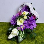 Piękny stroik na cmentarz w koszu z fioletowymi daliami i kremowymi różami