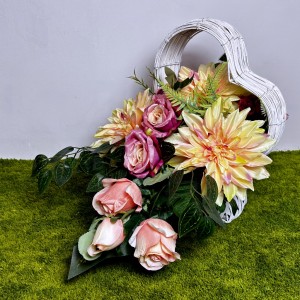 Piękny stroik na cmentarz w koszu-sercu z kremowo-różowymi daliami i cliviami.