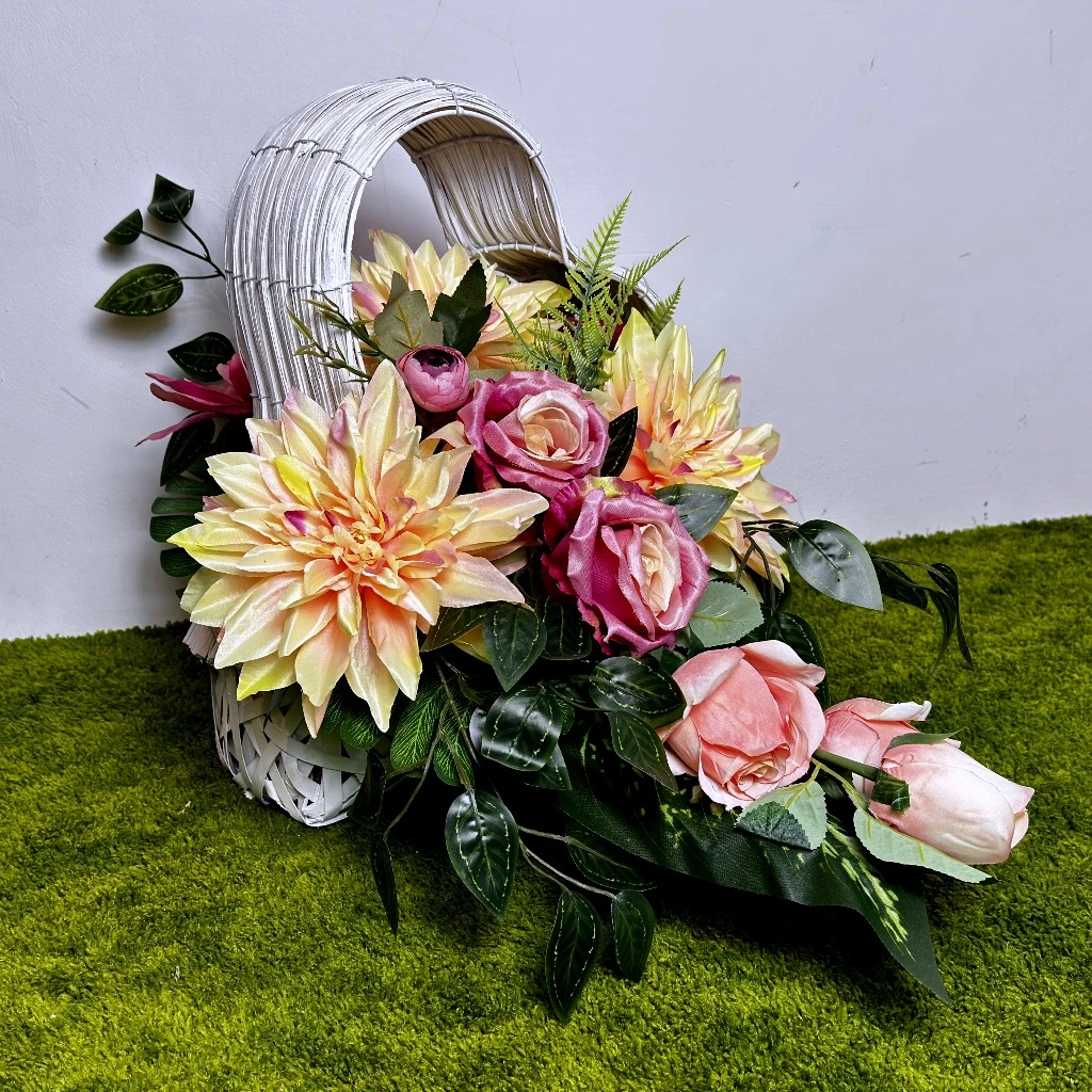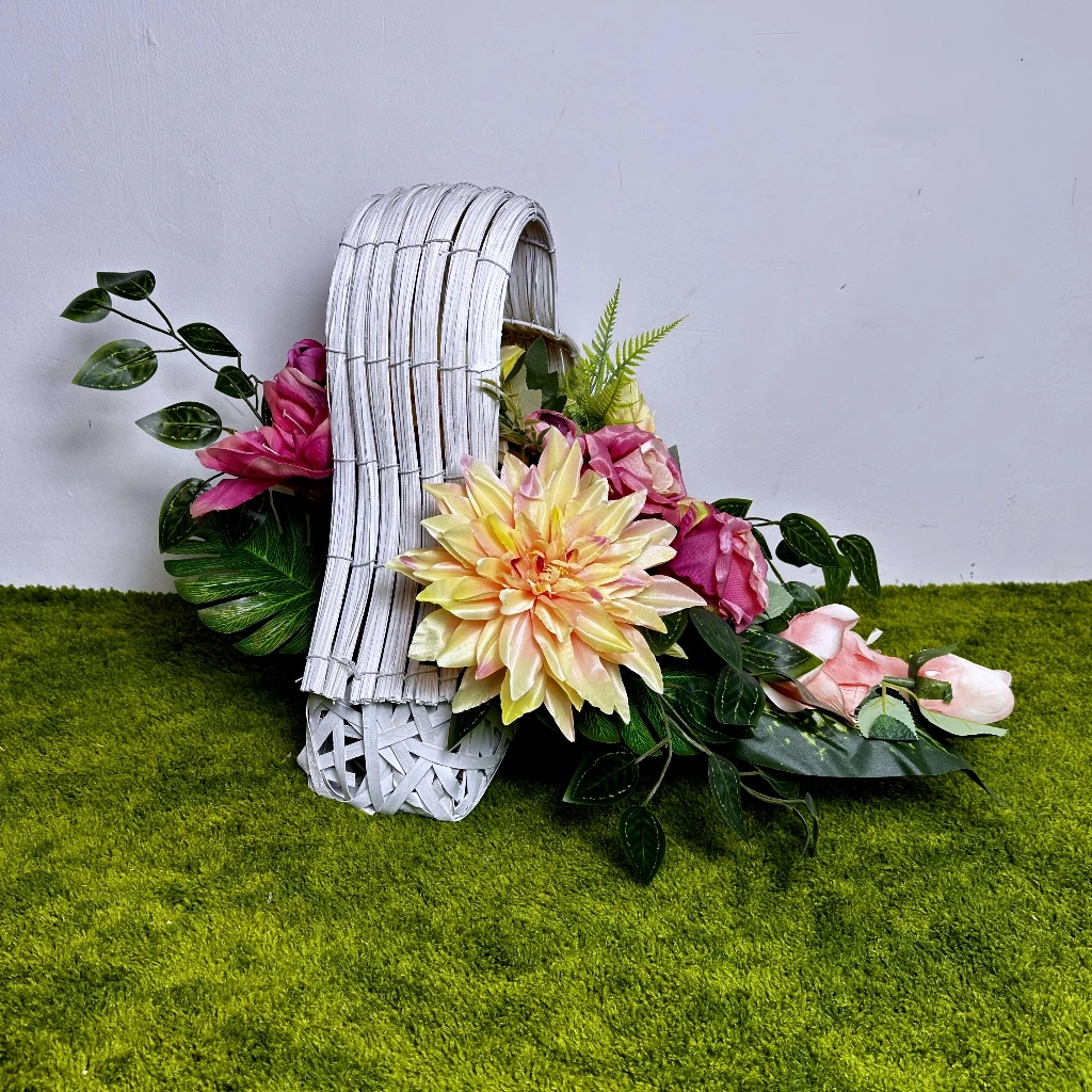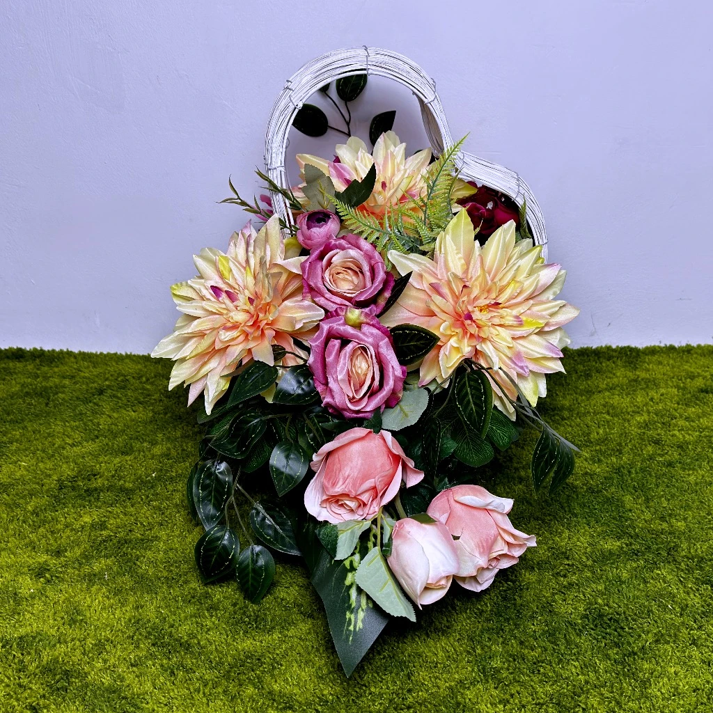 Wiosenny czas sprzyja wprowadzaniu świeżości do miejsc pamięci, a ta różowa kompozycja osadzona w jasnej wiklinie jest tego najlepszym przykładem. Centralnym punktem aranżacji są okazałe kremowo różowe dalie, których nasycony odcień natychmiast rozświetla otoczenie i nadaje mu radosnego charakteru. Towarzyszą im smukłe clivie oraz sztuczne róże, które tworzą harmonijną, wielopoziomową strukturę. Ten unikatowy biały kosz wiklinowy w kształcie serca stanowi dla nich szlachetne tło, sprawiając, że cała stojąca kompozycja (choć w formie leżącego serca) prezentuje się niezwykle lekko i szlachetnie. Jest to idealny wybór dla osób, które chcą, aby ich stroik wyróżniał się na tle tradycyjnych wiązanek swoją unikatową formą i nienaganną estetyką wykonania.