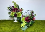 Kwiaty: zielone piwonie, bordowe róże na gałązce, bordowe kalie, purpurowe goździki, zielone mieczyki, czerwono-pomarańczowe storczyki.