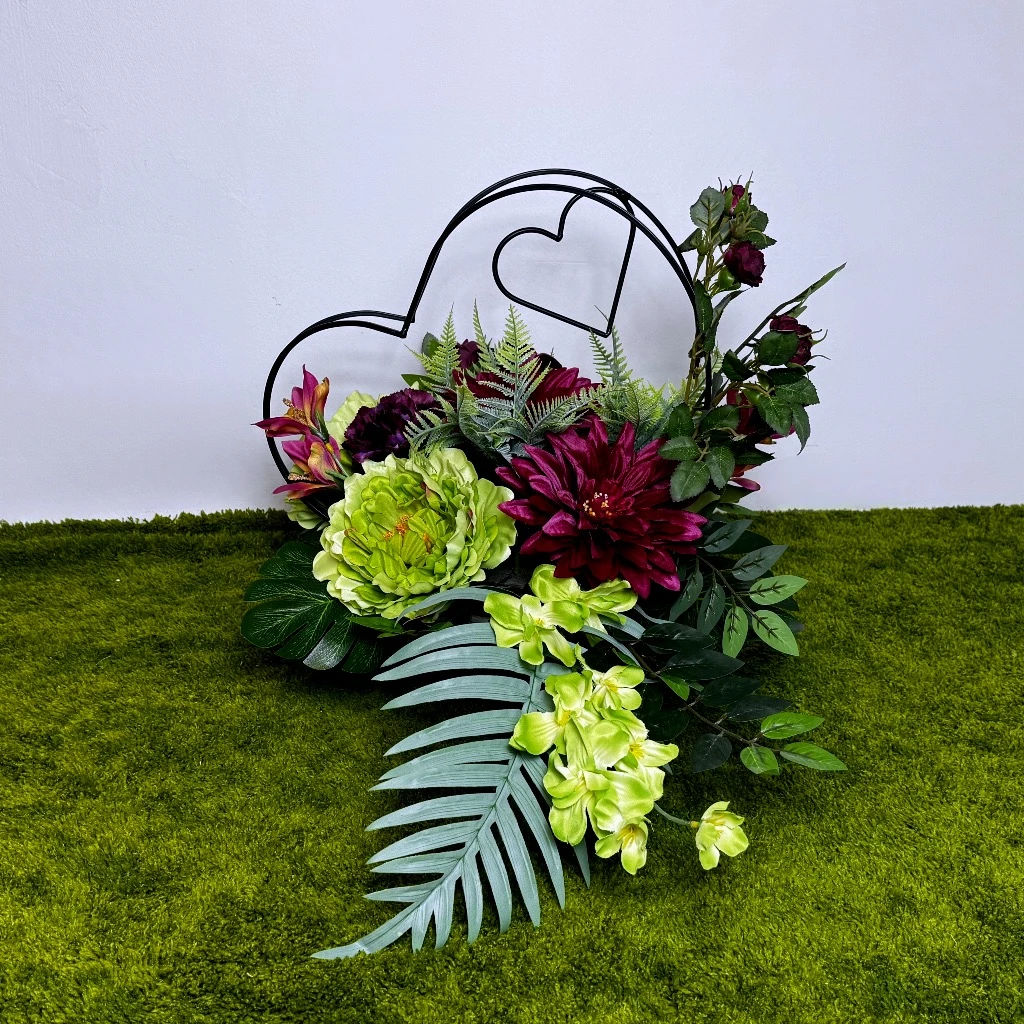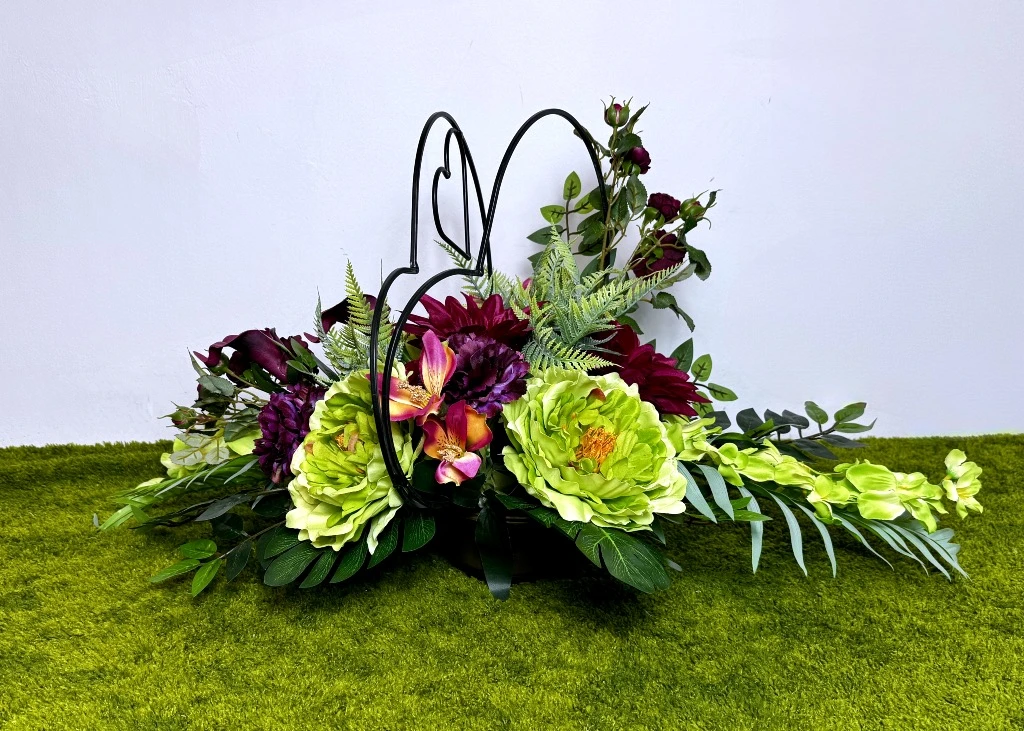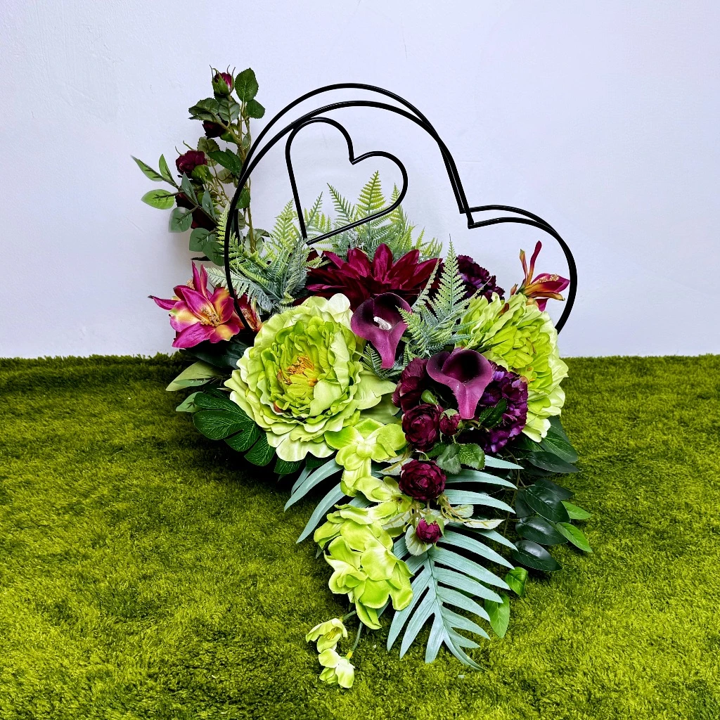 Fundamentem wizualnym tej aranżacji jest niezwykle rzadkie i efektowne połączenie kolorystyczne. Główną rolę grają zielone piwonie o gęstych, puszystych kwiatostanach, które wprowadzają do zestawu powiew wiosennej energii. Kontrastują one z dystyngowanymi, bordowymi kaliami o satynowym połysku oraz purpurowymi goździkami. Bordowe róże na gałązkach dodają kompozycji klasycznej elegancji, a czerwono-pomarańczowe storczyki wprowadzają radosne, rozświetlające refleksy. Całość uzupełniają strzeliste, zielone mieczyki, które nadają pionowego rytmu i sprawiają, że stroik prezentuje się bardzo okazale. Ta ekskluzywna mieszanka gatunków została osadzona wśród bogatej zieleni liści, co sprawia, że każda część zestawu wygląda na gęstą i kwitnącą, idealnie pasując na grób o każdej porze roku.