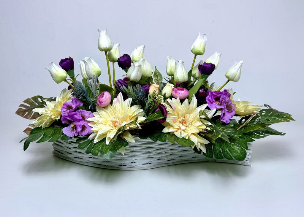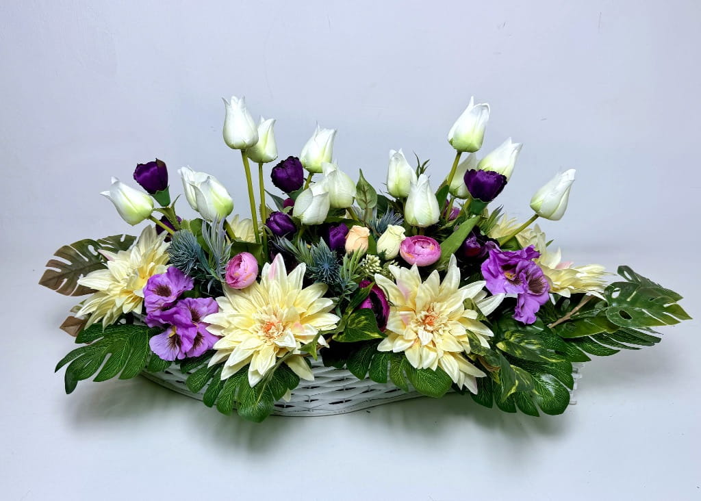 Ten nietuzinkowy i nowoczesny projekt to propozycja, która wnosi powiew świeżości w miejsca szczególnej zadumy. Całość została przygotowana z dobrej jakości sztucznych kwiatów, co sprawia, że ta piękna dekoracja zachowuje swój szlachetny wygląd przez wszystkie pory roku, niezależnie od kaprysów aury. Centralnym punktem są strzeliste, białe sztuczne tulipany, które w połączeniu z nasyconym fioletem mniejszych kwiatostanów tworzą świeży wygląd i harmonijną całość. Wykorzystana kompozycja kwiatowa w koszu to wyraz najwyższego kunsztu, gdzie sztuczne kwiaty jak żywe idealnie komponują się z jasną, plecioną bazą.