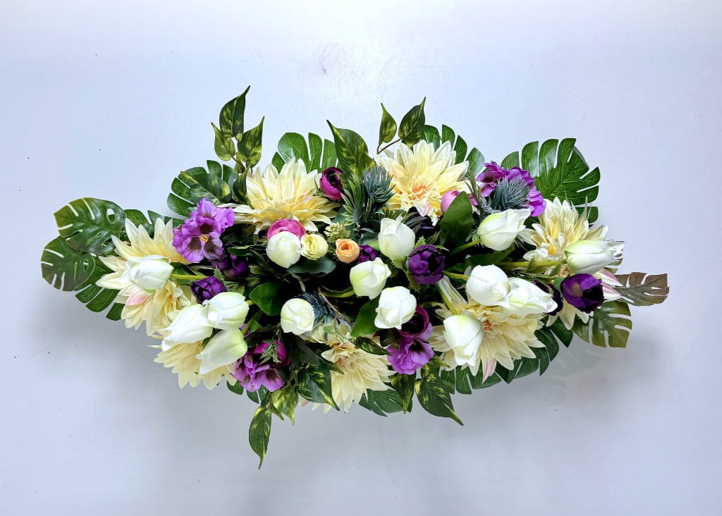 Bogactwo tej propozycji tkwi w umiejętnym zestawieniu delikatnych kremowych sztucznych dalii z wyrazistymi, fioletowymi akcentami bratków i jaskrów. Niezwykle istotną rolę odgrywa tutaj florystyka liściasta – efektowne liście monstery z wyraźnym unerwieniem tworzą gęste, zielone tło, które pięknie eksponuje kolorowe pąki. To estetyka, która nie wymaga pielęgnacji, a jednocześnie oferuje trwałe kwiaty cieszące oko przez wiele miesięcy. Jest to idealny wybór na cmentarz, zwłaszcza dla osób szukających produktów typu handmade o wysokim standardzie wykonania. Ta kompozycja w koszu na cmentarz łączy tradycję z nowoczesną formą, gdzie każdy stroik jest unikatowy.