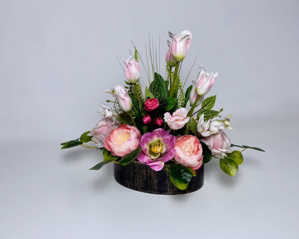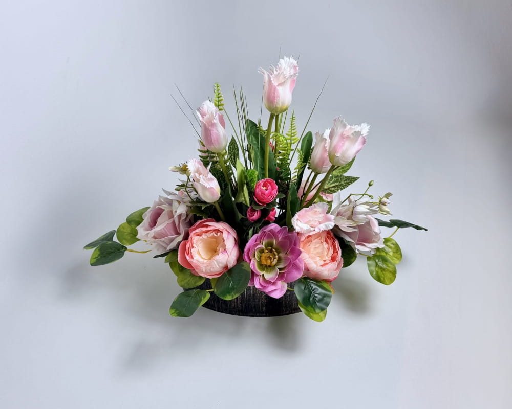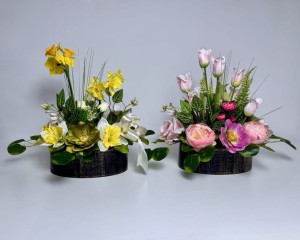 Wprowadź na płytę nagrobną powiew świeżości i elegancji dzięki tej wyjątkowej parze aranżacji. Każda kompozycja w koszu lub owalnej misie została przygotowana z dobrej jakości sztucznych kwiatów, co sprawia, że te sztuczne kwiaty jak żywe zachowują swój pierwotny blask przez bardzo długi czas. Oferujemy dwa warianty kolorystyczne, które pozwalają na idealne dopasowanie dekoracji do koloru granitu. Pierwsza opcja to hołd dla tradycji – dominują w niej słoneczne narcyzy oraz unikatowe, zielone lotosy, które w połączeniu z kremową kokardą tworzą niezwykle eleganckizestaw. Druga wersja to propozycja dla miłośników subtelnego różu i fioletu, gdzie prym wiodą tulipany oraz puszyste piwonie. Ta nowoczesna kompozycja na pomnik wyróżnia się na tle masowej produkcji dzięki autentycznemu, rzemieślniczemu wykończeniu.