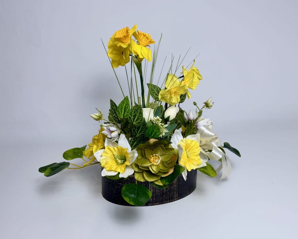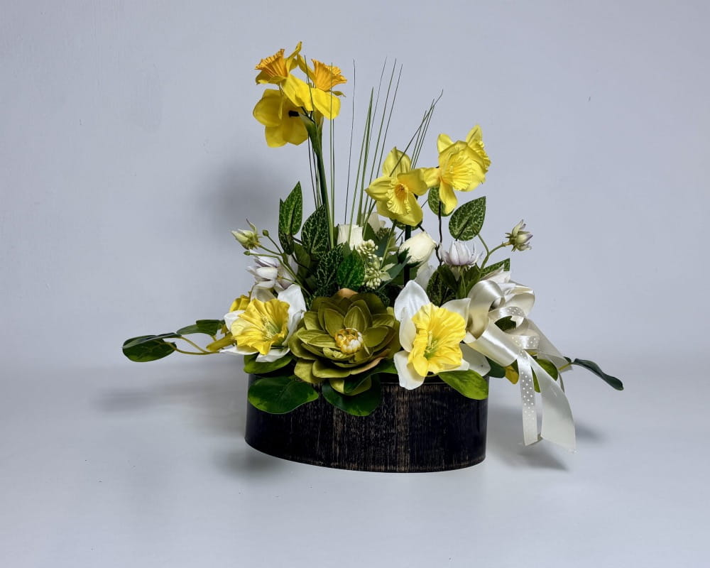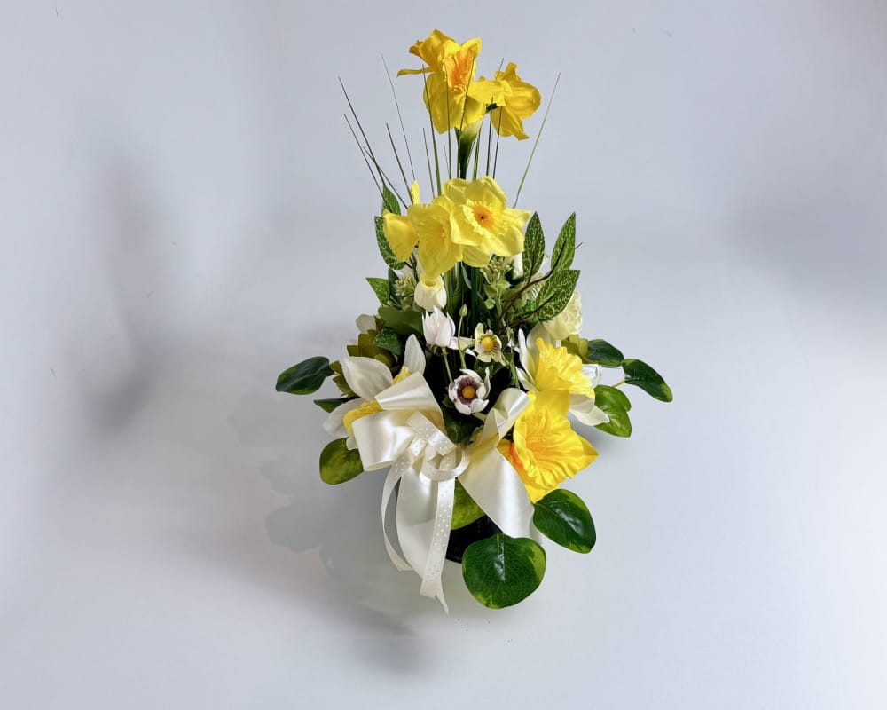 stroik na cmentarz, wiązanka na grób, kompozycja z żonkilami, tulipany na cmentarz, złota donica, narcyzy na grób, nowoczesna wiązanka, dekoracja nagrobna, kompozycja wiosenna, rękodzieło, luksusowy stroik, kwiaty na pomnik, florystyka nagrobna, piwonie na grób, lotos na cmentarz, stroik z narcyzami, producent stroików, wiązanka wielkanocna, wiązanka dla mamy, rocznica, wszystkich świętych, sztuczne kwiaty, produkt premium, kompozycja na pomnik, dekoracja grobu, kwiaty sztuczne, oryginalny stroik, żonkile, trwała wiązanka, kwiaty nagrobne.