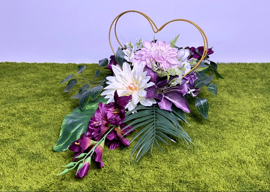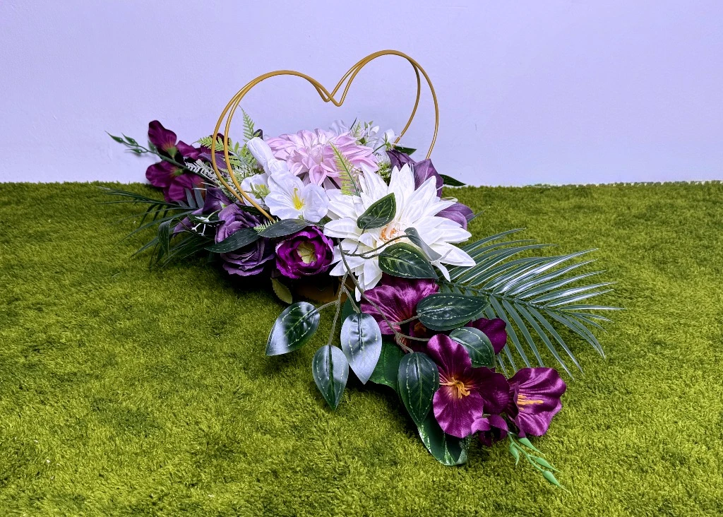 Solidny stroik na cmentarz został dociążony masą betonową ukrytą w podstawie złotego serca. Dzięki temu te kompozycje na cmentarz pewnie trzymają się płyty nawet przy porywistym wietrze. To trwała ozdoba na monument, która zastępuje nietypowe stroiki na cmentarz o mniejszej stabilności.