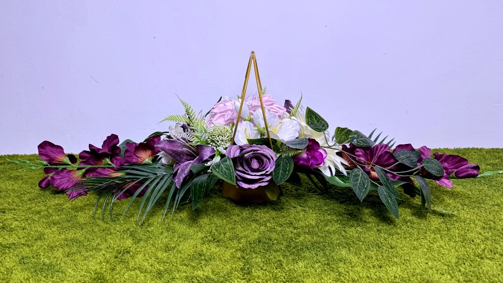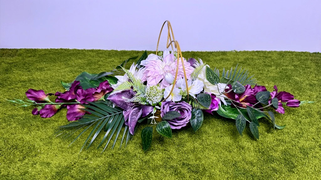 Wiązanka na grób „W różu” to propozycja dla osób szukających estetyki premium. Centralną część zajmują ciemnofioletowe lilie oraz malinowe mieczyki, które tworzą dynamiczny profil. Kremowe i różowe dalie rozświetlają całość, czyniąc te najpiękniejsze kompozycje na cmentarz idealnym wyborem na nekropolię. Ten nowoczesny stroik ze sztucznych kwiatów łączy nasycone barwy lilii z surowością metalowego stelaża, stanowiąc godny symbol pamięci o bliskich.