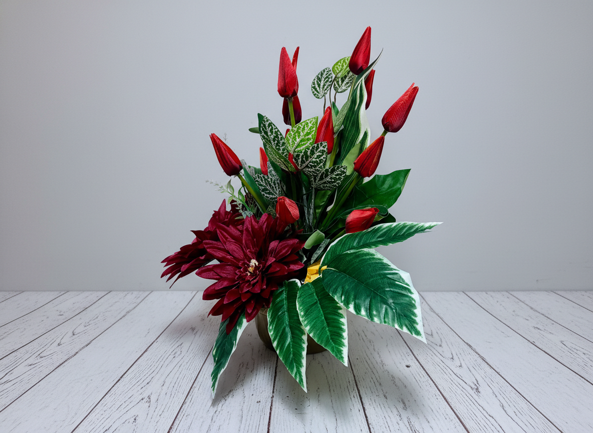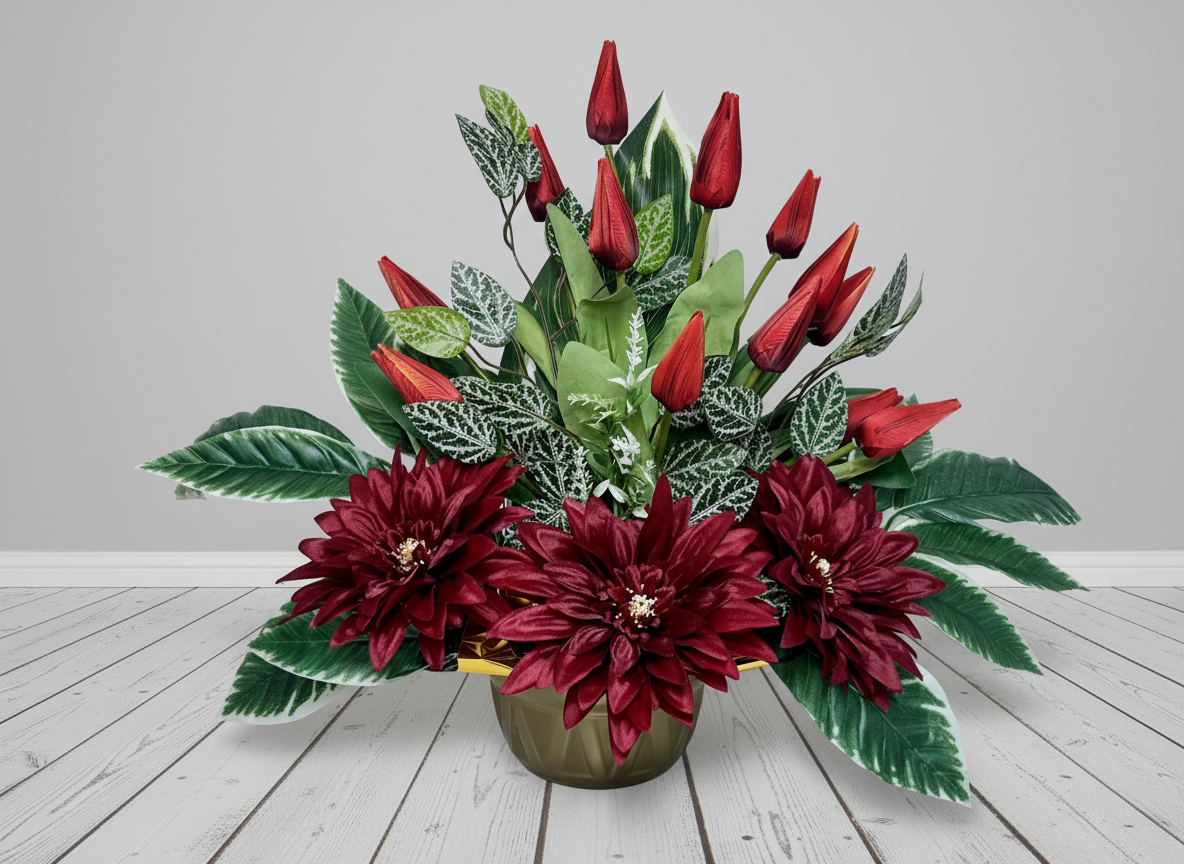 Głównym motywem dekoracji są liczne, czerwone tulipany wykonane z dobrej jakości sztucznych kwiatów. Ich nasycona barwa symbolizuje głębokie uczucia i pamięć, a zróżnicowane stadia rozkwitu – od zamkniętych pąków po pełne kielichy – nadają całości naturalnego wyglądu. Tulipany zostały zestawione z okazałymi daliami w pasującym, czerwonym odcieniu. Dalie, dzięki swojej gęstej strukturze płatków, dodają kompozycji wizualnego ciężaru i luksusowego charakteru. Połączenie smukłych tulipanów z pełnymi formami dalii tworzy ciekawą, wielowymiarową teksturę, która przyciąga wzrok i zachowuje świeżość barw niezależnie od nasłonecznienia.
