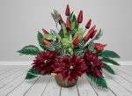 Ta wyjątkowa dekoracja stojąca to hołd dla klasycznej elegancji, wyrażony poprzez najbardziej rozpoznawalne symbole wiosny. Kompozycja została osadzona w złotej okrągłej donicy, która stanowi idealny fundament dla intensywnej czerwieni kwiatów. Dzięki swojej strzelistej formie i starannemu doborowi roślin, stroik prezentuje się niezwykle godnie, stanowiąc wyrazisty akcent dekoracyjny na każdym nagrobku.