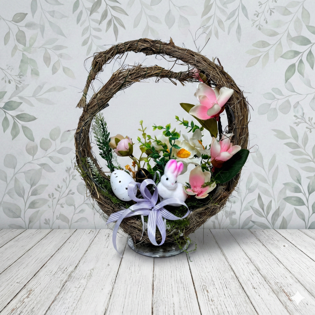 Ta wyjątkowa kompozycja została przygotowana w formie urokliwego koszyczka. Wykonana została z dobrej jakości sztucznych kwiatów oraz starannie dobranej zieleni dekoracyjnej, dzięki czemu zachowuje swój wyjątkowy wygląd przez bardzo długi czas. Jest to dekoracja idealna na okres wiosenny, stanowiąca ciekawą i trwałą alternatywę dla żywych roślin, które wymagają regularnego podlewania i pielęgnacji.