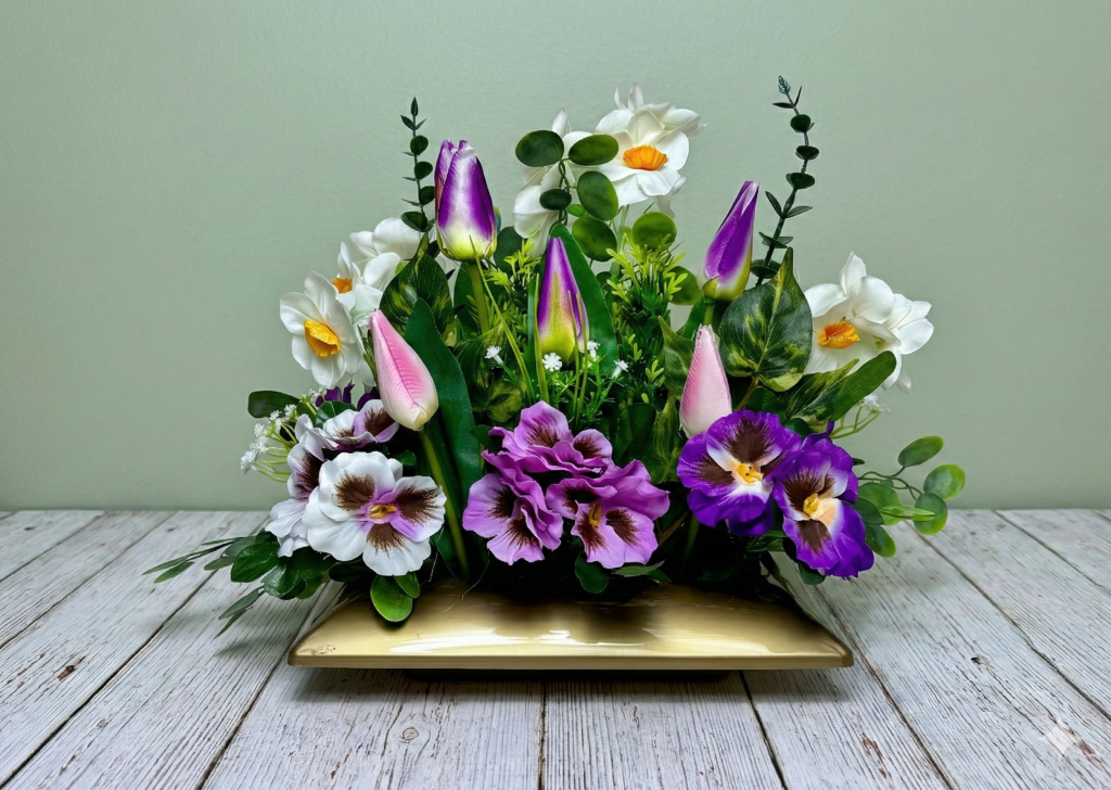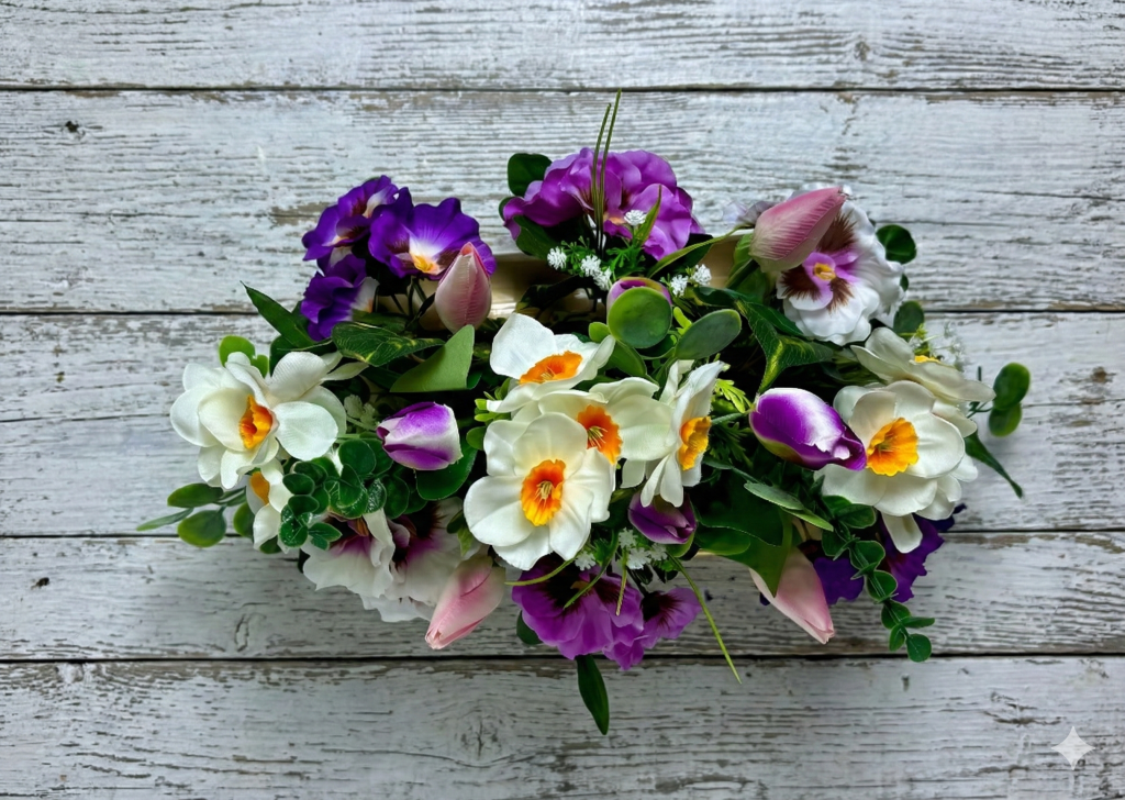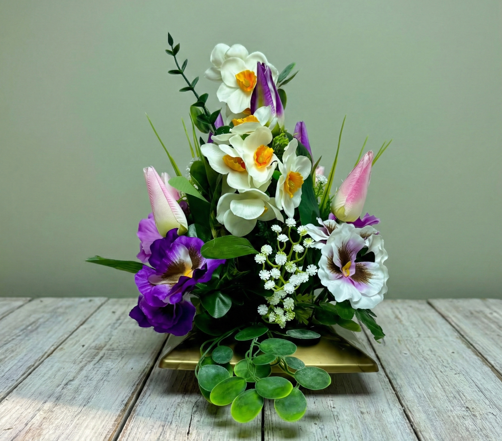 Prezentujemy Państwu wyjątkowy projekt, jakim jest wiosenna kompozycja kwiatowa, stworzona z myślą o dekoracji nagrobków w okresie świątecznym i wczesnowiosennym. Ten niepowtarzalny stroik został zaprojektowany jako forma dwustronna, co czyni go idealnym rozwiązaniem na groby o różnej konstrukcji, zapewniając nienaganny wygląd z każdej perspektywy. Całość została przygotowana ręcznie z dobrej jakości sztucznych kwiatów, dzięki czemu te kwiaty sztuczne wyglądają jak żywe, zachowując przy tym pełną odporność na zmienne warunki pogodowe.